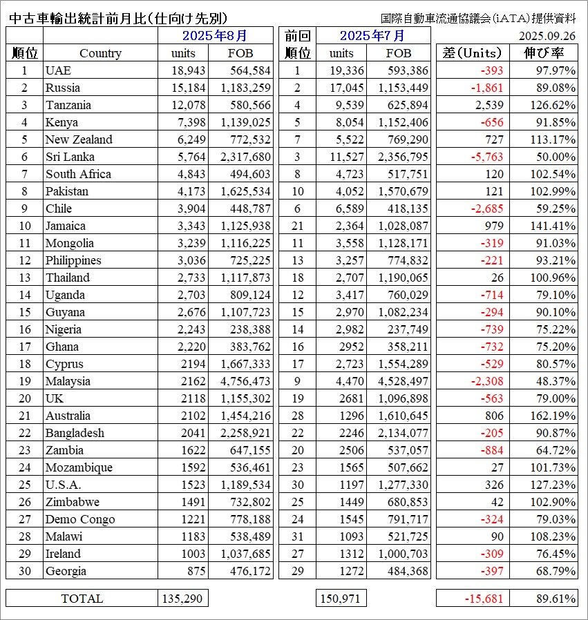 7月中古車輸出20%増加スリランカ1万台超、UAE26%増、ロシア2割減、モンゴル激減続く 2025年7月の中古車輸出は、15万971台で、前年同月に比べ20.0%の増加を記録した...