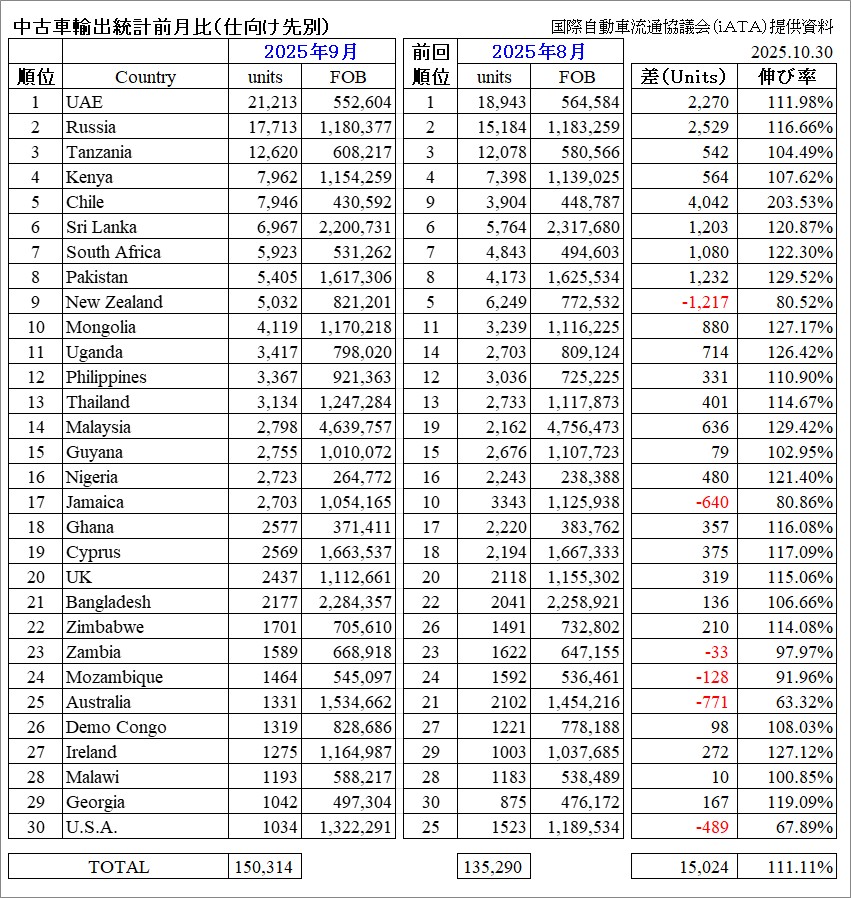 iATA速報 10月中古車輸出、再び増加、ロシア向け依然プラス バングラ、キプロス大幅減